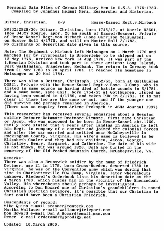 Personal Data Files of German Military Men in USA 1776-1783. Compiled by Johannes Helmut Merz, Researcher and Historian.