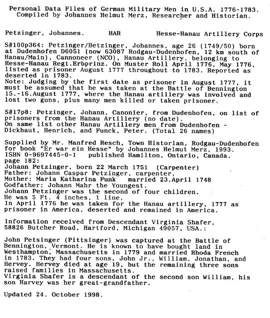 Personal Data Files of German Military Men in USA 1776-1783. Compiled by Johannes Helmut Merz, Researcher and Historian.